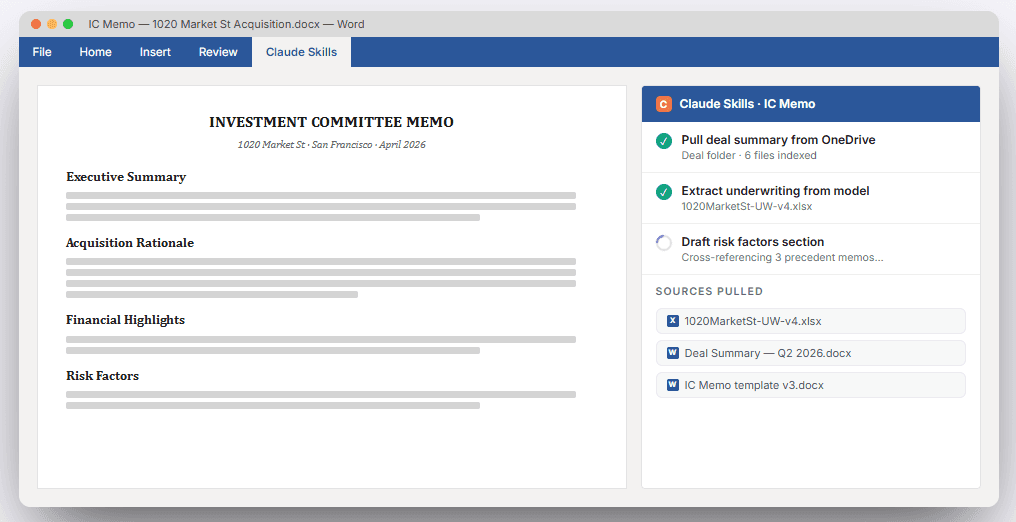 Draft IC memos, acquisition summaries, and underwriting narratives directly in Word. Generate model commentary and sensitivity summaries inside Excel. Pull deal context from email, SharePoint, and Teams into a single brief before IC meetings.